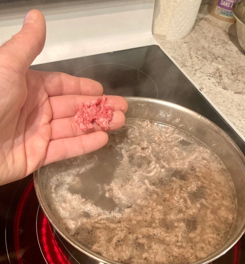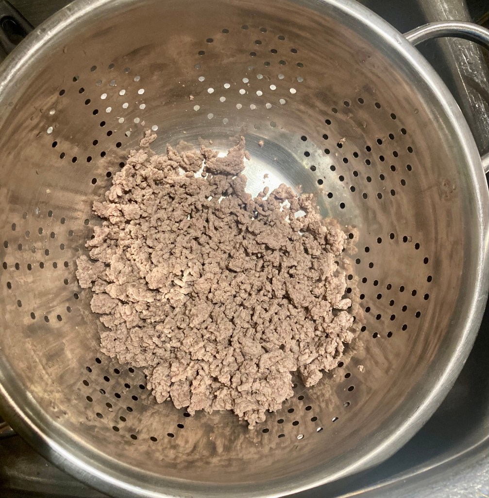Once cooked completely through, strain the mostly fat free water from the meat into the sink, using a large strainer/collander.