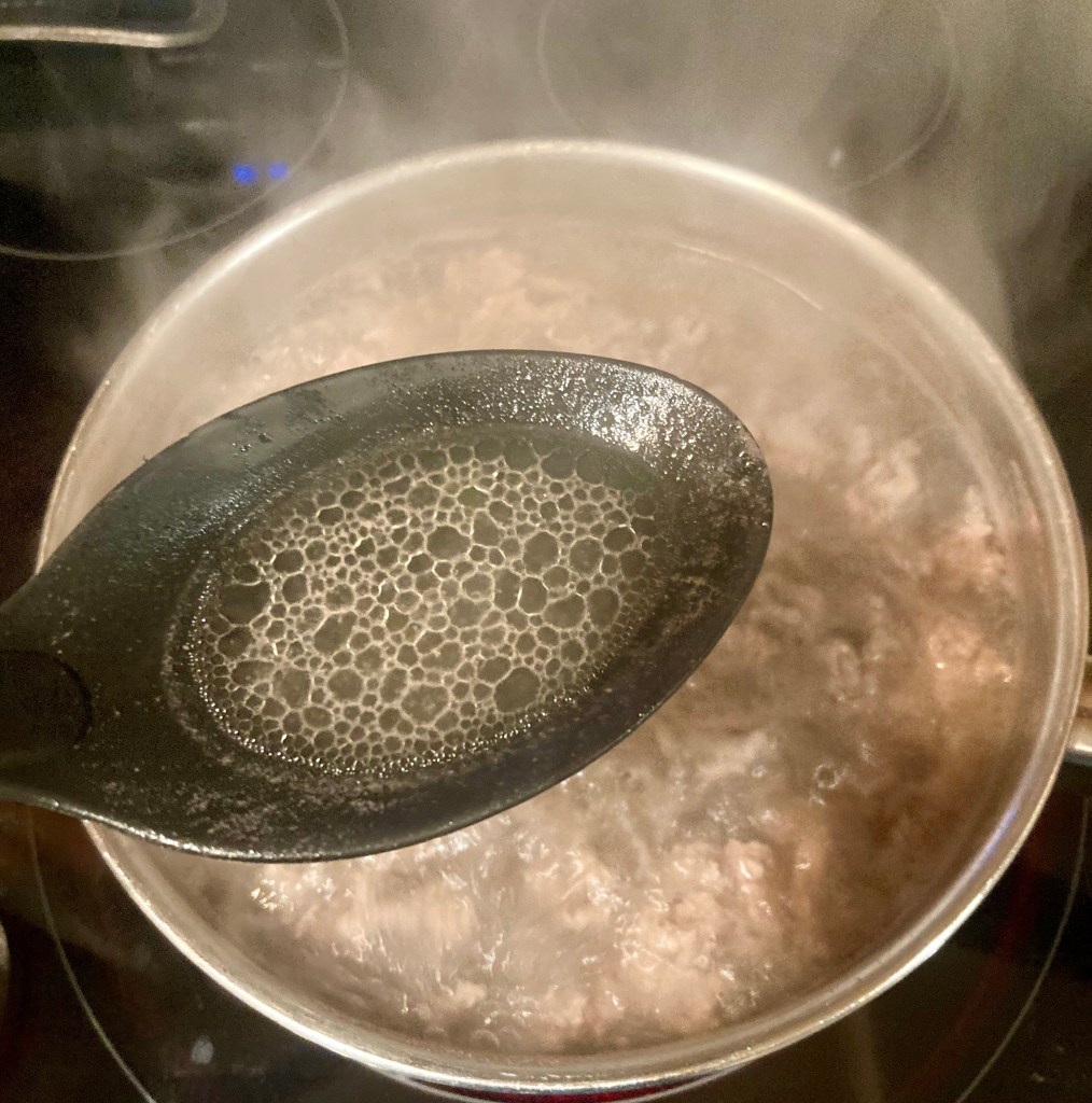 Note: I use the boil to cook method over the fry to cook method for a few reasons. Boiling allows more fat to separate easier from the meat. I find it allows more even cooking, cooks relatively fast and doesn’t allow the meat to overcook or become “gravelly” prior to dehydrating, all of which seems to create a better end product.